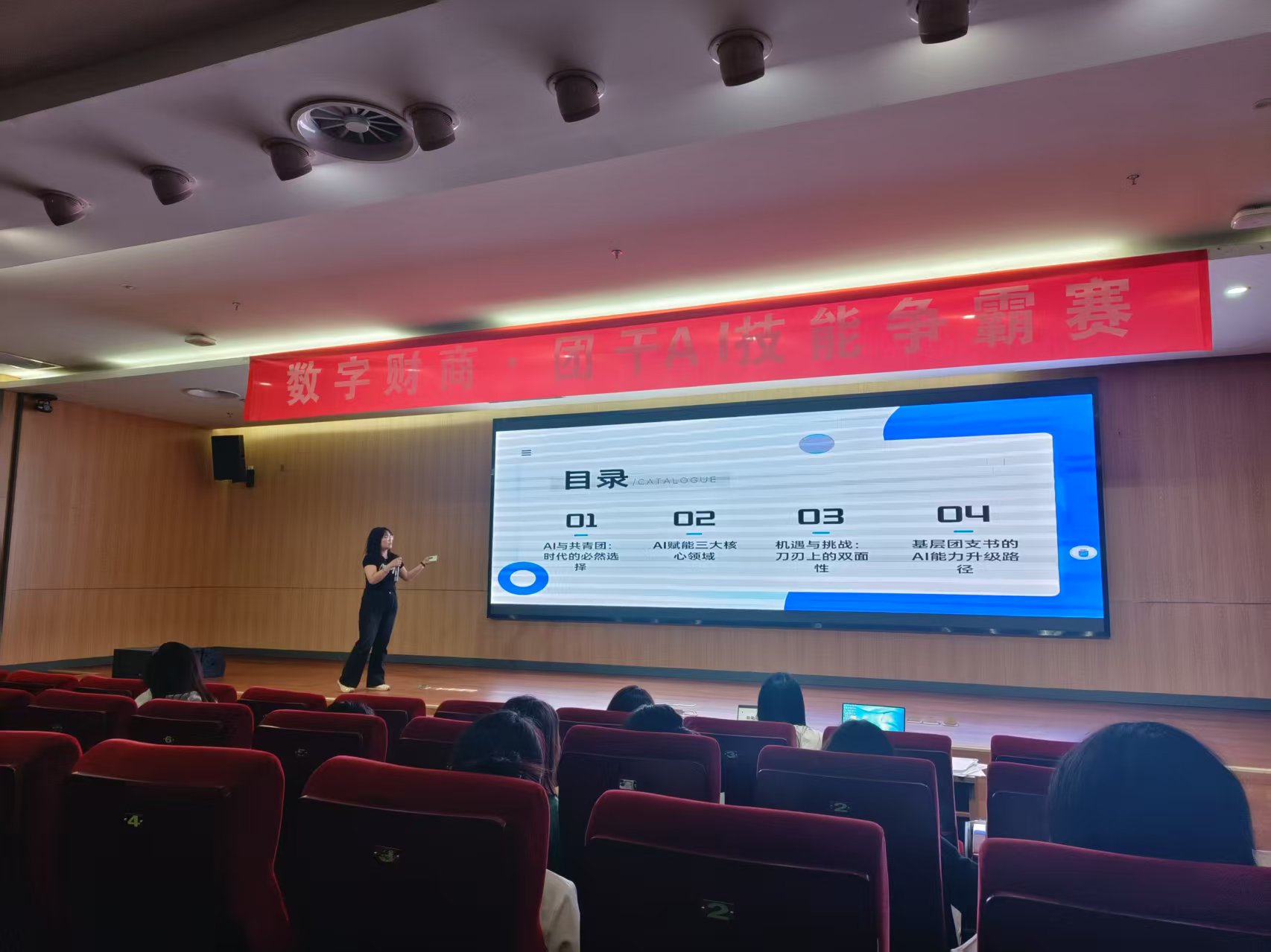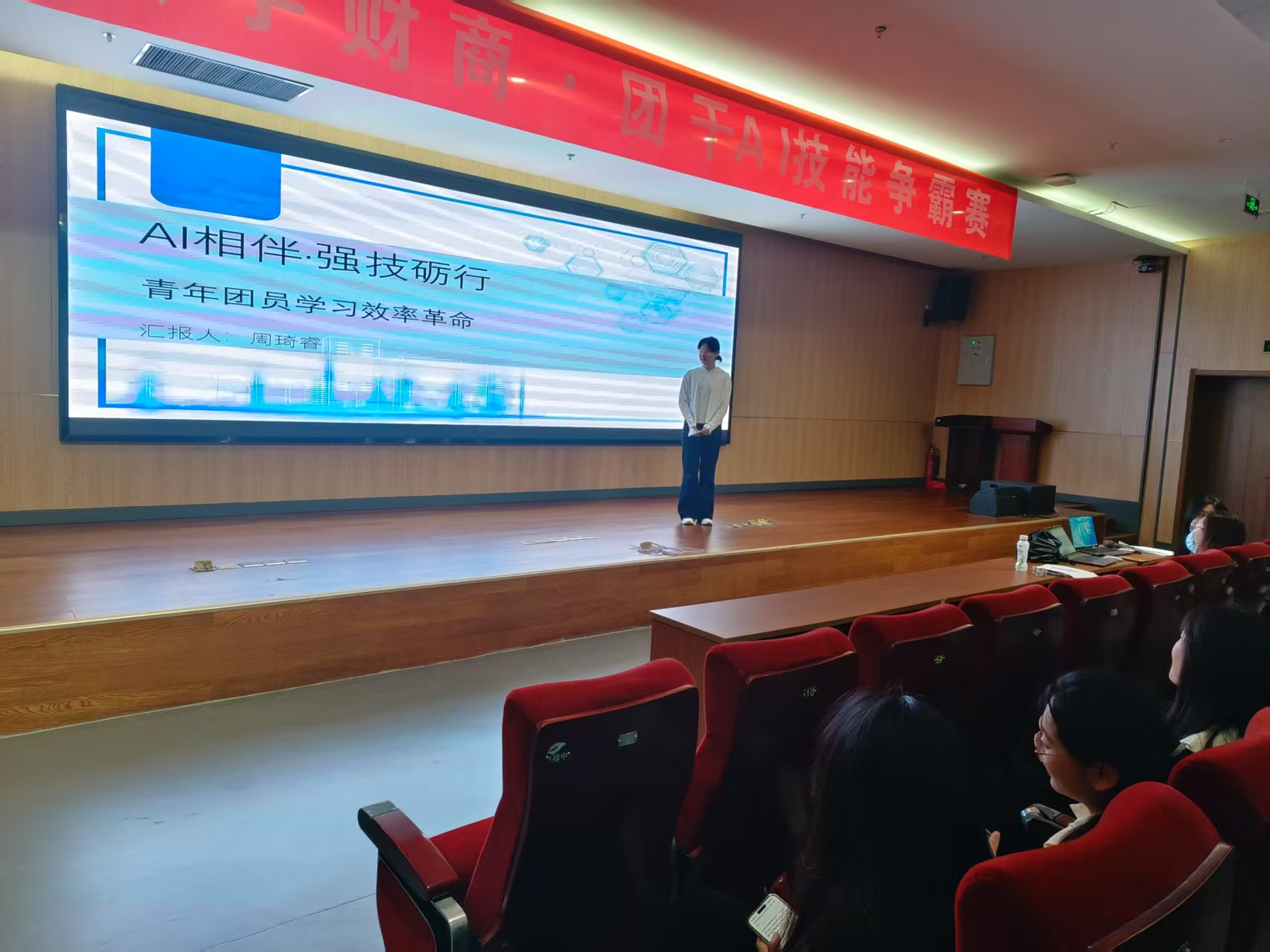 演讲过程中,各团支书结合实际案例,展示了人工智能在生活和工作中的广泛应用,深入浅出地阐述了如何通过科技手段提高学习效率、拓宽职业发展视野,向在场的同学们传递了AI时代不可忽视的重要性。活动现场,团支书们的演讲内容紧扣主题、条理清晰,互动环节更是充满激情与挑战。评委们针对每位团支书的表现提出了问题,团支书们则凭借自身对人工智能的深刻理解和创新思维进行了精准地回答,充分展示了他们的思辨能力与语言表达能力。